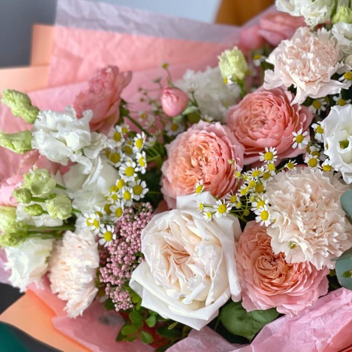 Букет в персиковой нежной гамме с очаровательными кустовыми пионовидными розами Джульетта, ароматными розами Вайт Охара, белыми лизиантусами и гвоздиками.Шикарный подарок на день рождения любимой девушке, маме, подруге.К каждому букету мы прикладываем:- открытку с Вашими пожеланиями- инструкцию по уходу за букетом- подкормку для цветов