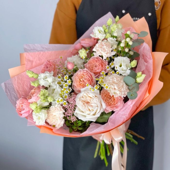пионовидная кустовая роза джульетта – 3 шт.Пионовидная роза – 1 шт.Матрикария – 5 шт.Лизиантус – 2 шт.Хиперикум – 1 шт.Гвоздика – 3 шт.Озотамнус – 1 шт.Эвкалипт – 2 шт.Фисташка – 1 шт.Упаковка дизайнерская – 1 шт.