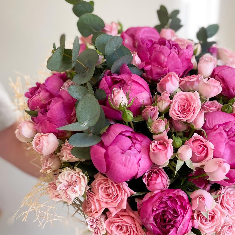 Гвоздики, Лизиантусы, Розы, Тюльпаны