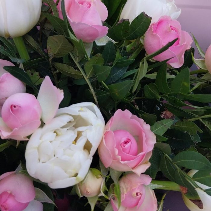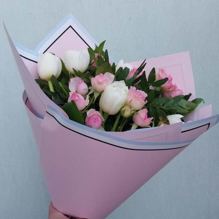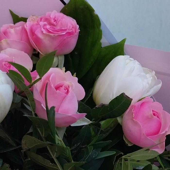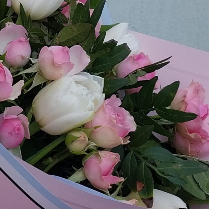 Гвоздики, Лизиантусы, Розы, Тюльпаны