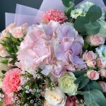 Нежный букет в бело – розовых тонах с Гортензией и Розами . Выглядит стильно, воздушно , по-летнему очаровательно и свежо .