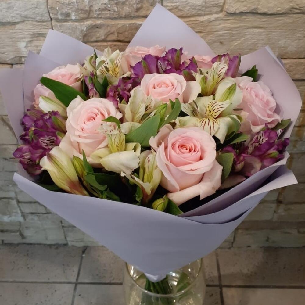 Розы и Альстромерии в классическом и очень нежном букете.(цвет роз и альстромерий в букете может отличаться от фото, наличие по цветам желательно уточнить )