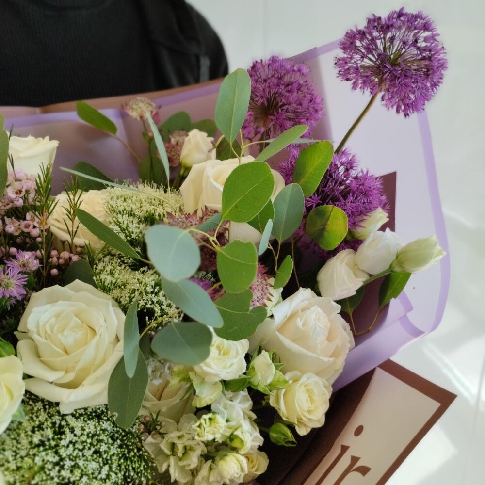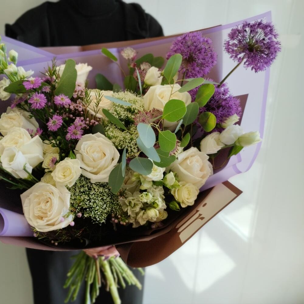 Роза – 9 шт.Роза кустовая – 4 шт.Лизиантус – 3 шт.Аллиум – 3 шт.Трахелиум – 3 шт.Астра кустовая – 3 шт.Астранция – 2 шт.Маттиола – 3 шт.васкфлауэр – 2 шт.Эвкалипт – 2 шт.Фисташка пучок – 1 шт.Упаковка дизайнерская – 5 шт.