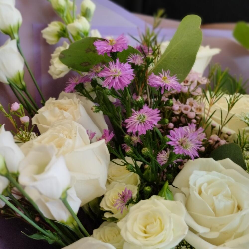 Сборный букет с розами, маттиолой, лизиантусом, эвкалиптом
