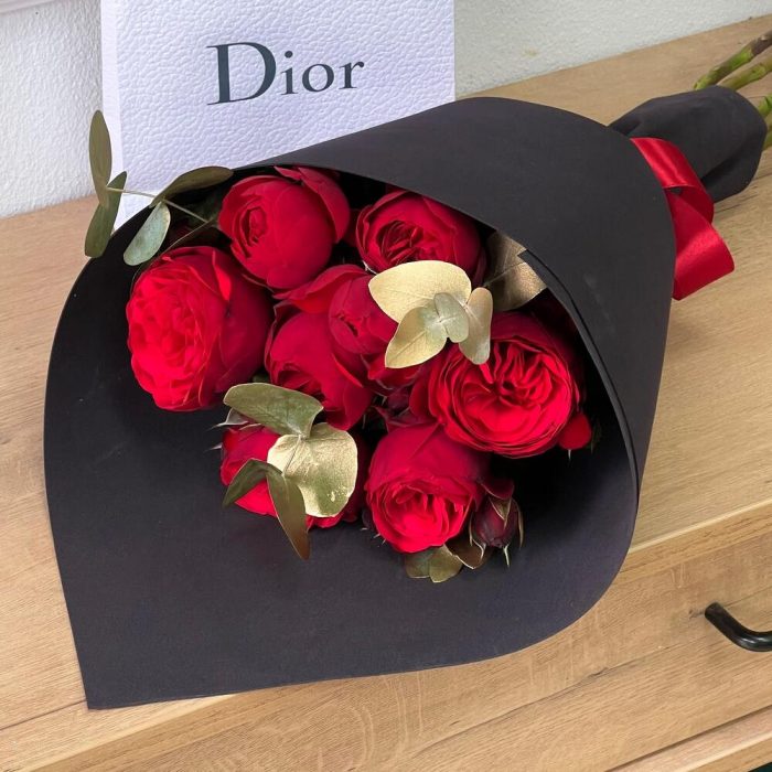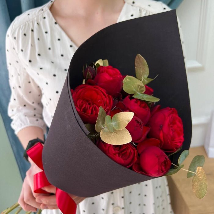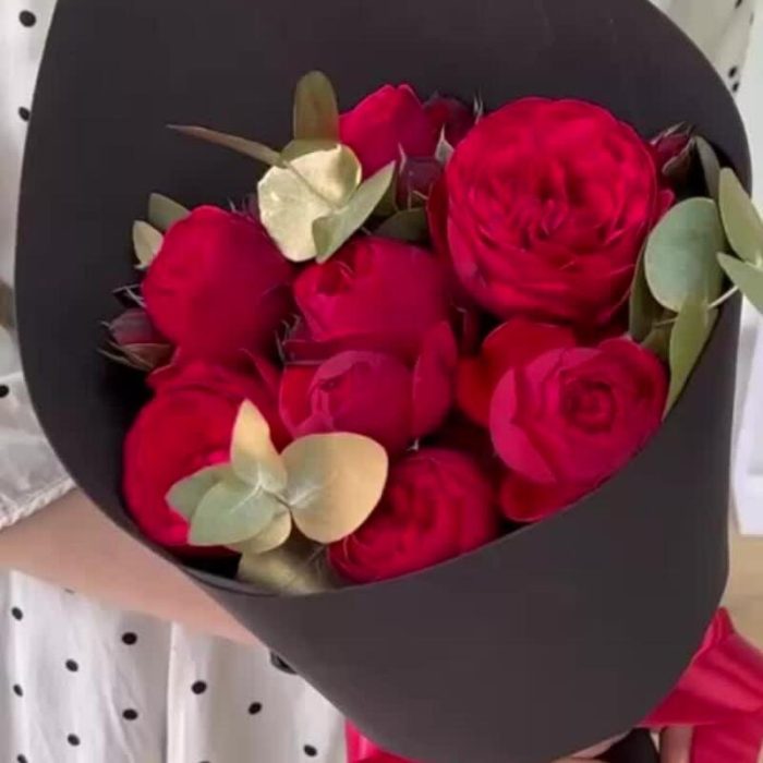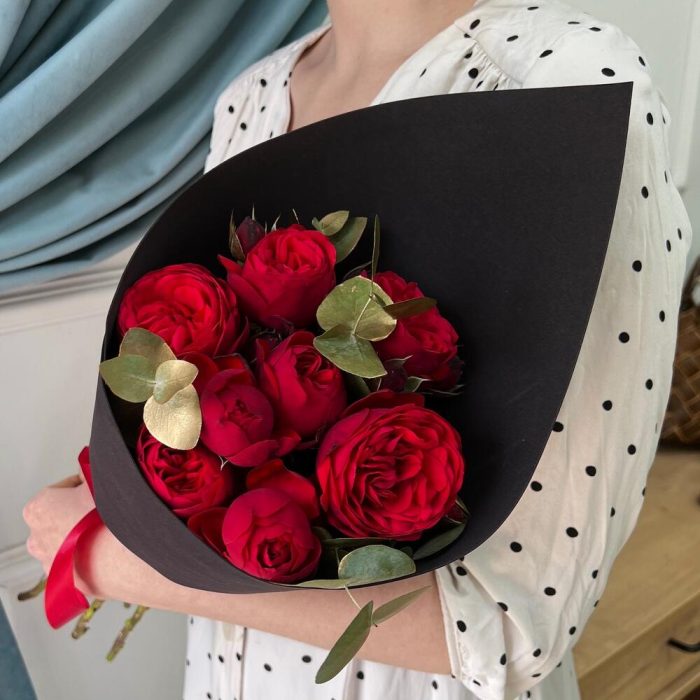 роза пионовидная ред пиана – 7 шт.Эвкалипт – 3 шт.Дизайнерская упаковка – 1 шт.Лента атласная – 1 шт.подкормка для срезанных цветов – 1 шт.рекомендация по уходу за цветами – 1 шт.
