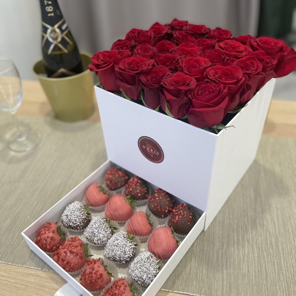 Шкатулка с розами и клубникой в шоколаде
