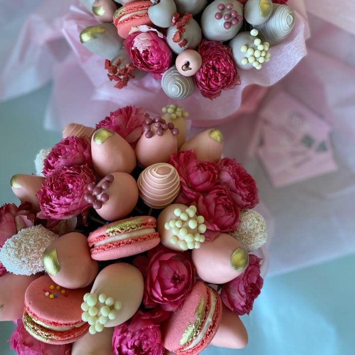 Пионовидная кустовая роза – 3 шт.макарон (пирожное) – 5 шт.Клубника в шоколаде callebaut (бельгия) – 25 шт.