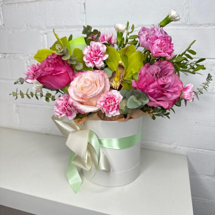 Роза Эквадор – 3 шт.Орхидея Цимбидиум – 2 шт.Диантус кустовой – 5 шт.Эвкалипт – 5 шт.Фисташка – 3 шт.Оазис флористический – 1 шт.Шляпная коробка – 1 шт.