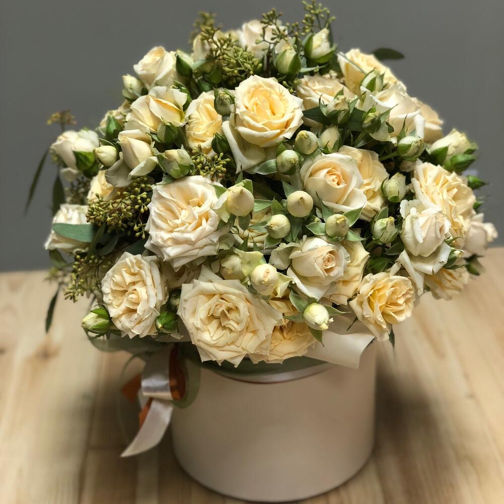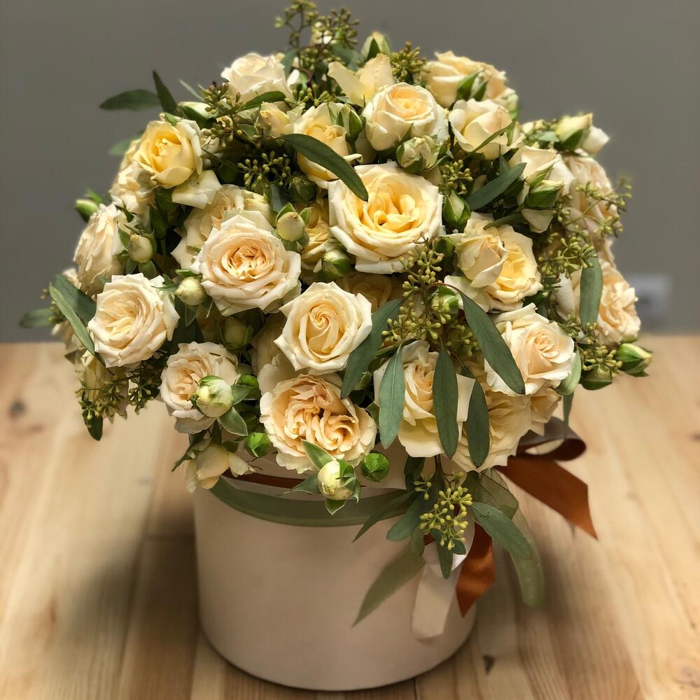 Роза кустовая – 11 шт.Эвкалипт – 3 шт.Шляпная коробка с лентами – 1 шт.Оазис флористический – 1 шт.Упаковка дизайнерская – 1 шт.