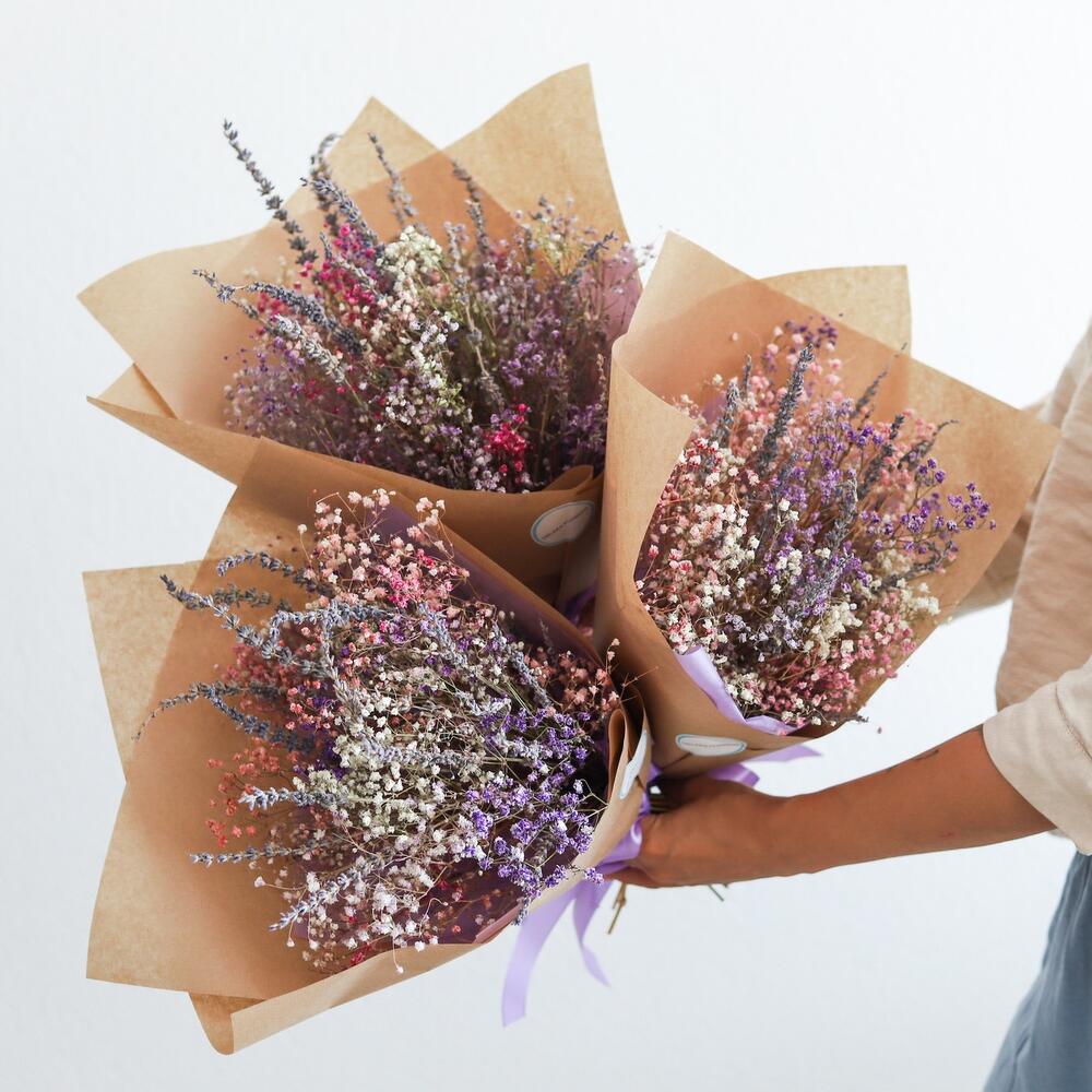Лента – 1 шт.Тишью – 1 шт.Крафт – 1 шт.Лаванда пучок – 2 шт.гипсофила сухая – 5 шт.