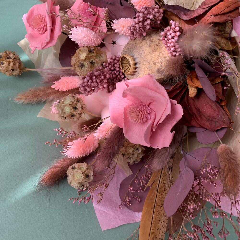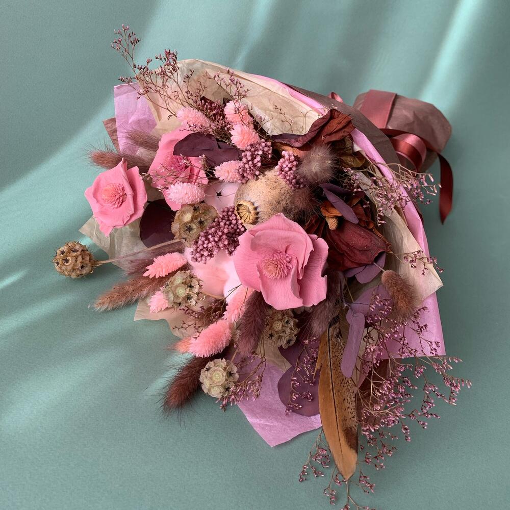 Хлопок натуральный – 3 шт.Цветы стабилизированные – 3 шт.Озотамнус розовый – 5 шт.перо декоративное – 1 шт.Эвкалипт стабилизированный – 5 шт.Лимониум – 1 шт.Лагурус – 9 шт.фаларис розовый – 9 шт.Скабиоза – 5 шт.антуриум сухоцвет – 3 шт.мак коробка – 1 шт.пампасная трава – 2 шт.Тишью – 3 шт.ленты атласные – 2 шт.