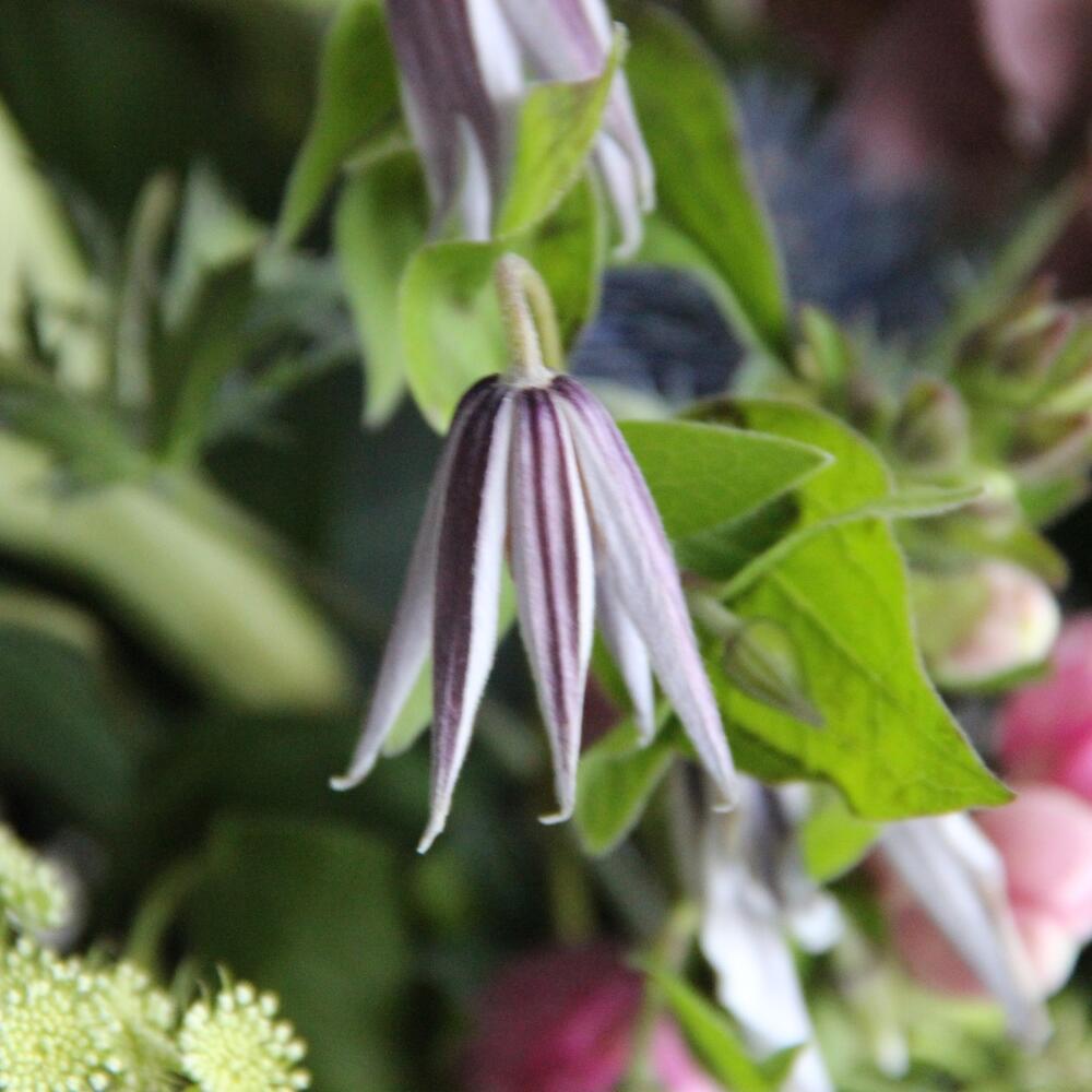 Лилия лонги – 3 шт.флебодиум – 2 шт.эрнигиум – 1 шт.Клематис – 1 шт.Львиный зев – 3 шт.Амми – 3 шт.Хелеборус – 3 шт.Эвкалипт – 2 шт.Лагурус – 9 шт.Лента атласная – 1 шт.